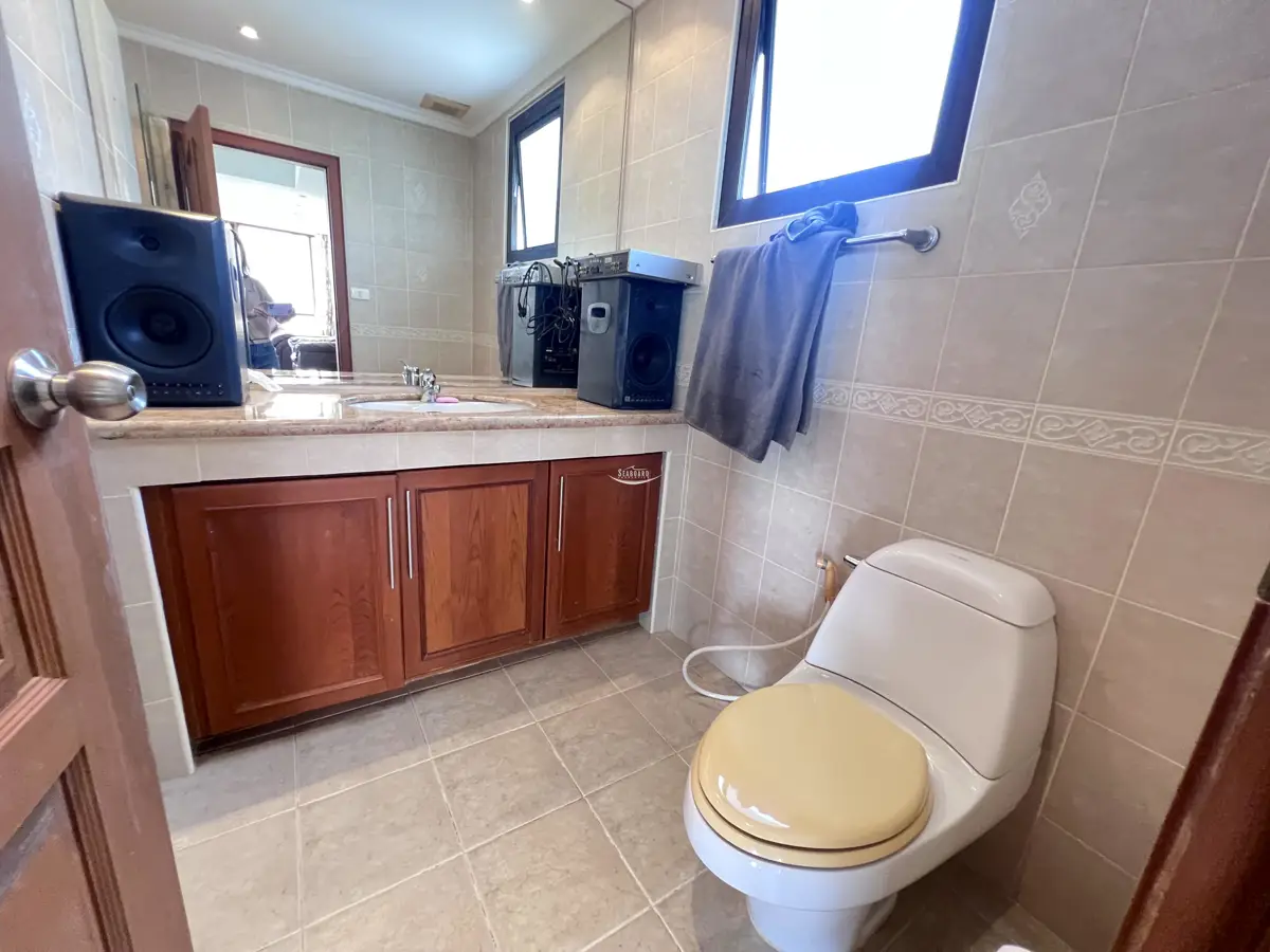 This 22nd-floor one-bedroom apartment boasts stunning ocean and Koh Larn island views. It features a modern kitchen, air conditioning, a spacious sea-view balcony, a fitted wardrobe, and two bathrooms.